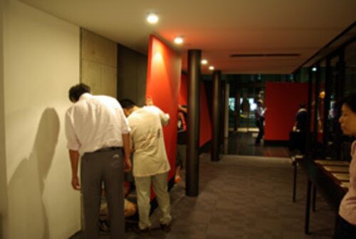 さて,早速時系列順に2nd. stageを振り返っていきましょう.まずは,ルネスホールの「ジャズmeetsアート」の前夜準備状況からです. 今回は,イベント一週間前からルネスホール内「公文庫カフェ」に山本容子さんの作品を8点展示していました.この赤壁の制…